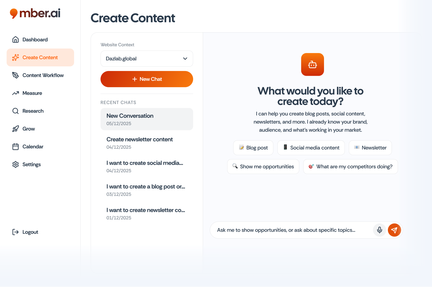 Mber.ai turns a 15-minute conversation into weeks of content for your website. No writing required. Just talk about what you know.