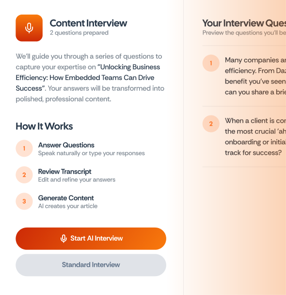 Mber.ai doesn't ask you to write. It asks you to share what you already know. Our AI interviews you about topics your audience is actually searching for—then turns that conversation into polished, SEO-ready content.